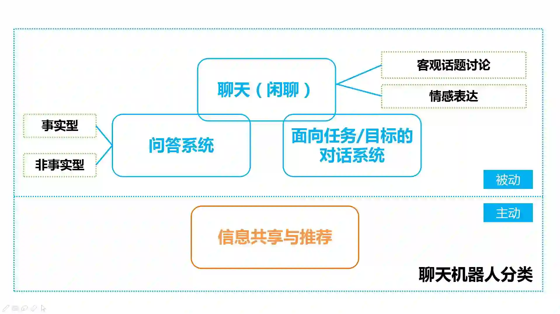 目前主动交互更多作为传统交互方式的一种补充,作为辅助手段,并未大规模得到广泛使用。从功能角度来看,聊天机器人可以细分为以闲聊为主的聊天,问答和面向任务或目标的对话。其中,若根据场景切分,闲聊可以进一步分为情感交流和针对客观话题的讨论。问答系统需要不仅考虑如What、Who、Which、Where和When等事实型问答(Factoid QA),也需要考虑如How和Why等非事实型问答。