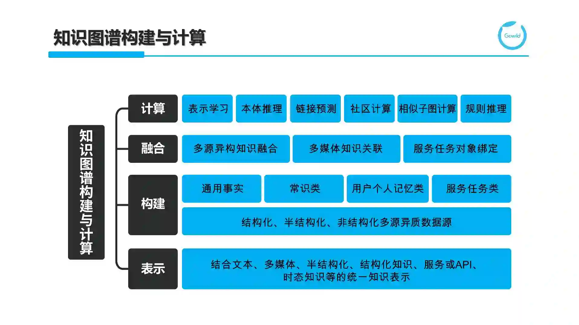 从更技术的角度来说,我们需要考虑知识图谱将如何构建与计算。这里不仅包含如何结合文本、多媒体、半结构化、结构化知识、服务或API,以及时态知识等的统一知识表示。在此基础上,需要进一步考虑如何结合结构化(如关系型数据库)、半结构化(HTML或XML)和非结构化(文本、图像等)多源异质数据源来分别构建通用事实类(各种领域相关实体知识)、常识类、用户个人记忆类、机器人自我认知类和服务任务类知识库等。