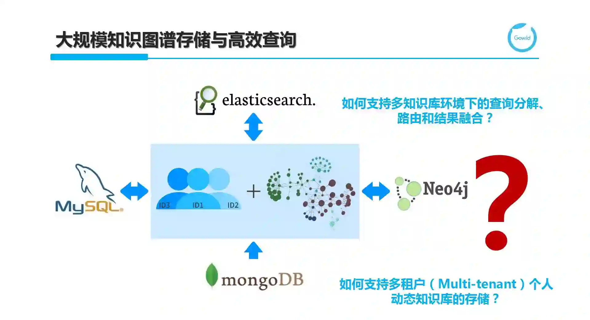 从工程应用的角度,我们更愿意站在巨人的肩膀上,选择一个现有数据库或几个数据库的组合来形成高效的图谱存储。注意:这里所谓的存储,不仅仅是将知识存放的问题,而是考虑存储之后是否可以根据图谱的规模、读写特点和查询推理等基础在线操作的效率等多个因素来考量。MongoDB,作为面向文档(Document Oriented)的NoSQL代表,他支持无模式(Schemaless)的数据建模方式,即不要求一开始就将Schema都确定,而可以按需进行添加或修改。这对于需求经常变更或一开始对领域不是完全了解的情况下,支持自底向上方式的知识管理。不过MongoDB仅支持数据库级别的锁,写入速度受限。对于读并发的提高,可以使用基于数据分片(Data Sharding)的分布式版本。关系型数据库MySQL应用广泛,也被用于Apache Jena(HP开源的RDF数据库)中TDB的存储引擎。而ElasticSearch支持图谱上的简单模式(如单关系或链式)查询,适合如Facebook Graph Search或聊天机器人中大部分口语对话,因此也是面向聊天对话的知识图谱存储方案之一;Neo4j是知名的图数据库,不同于RDF数据库,它的数据模型是属性图(property graph),基于图遍历(graph traversal)来实现各种查询功能,对于大部分熟悉面向对象编程的工程师来说非常容易上手。基于上述任何一个数据库或多个数据库的组合来满足知识图谱的管理都是工程做法。从研究的角度来说,希望做一个统一的存储和查询引擎,需要支持多租户(multi-tenant)环境下的海量个人和机器人知识图谱管理,以及融合个人图谱和全局知识上的查询分解、分布式环境下的查询路由和子查询执行,以及结果融合等操作。
