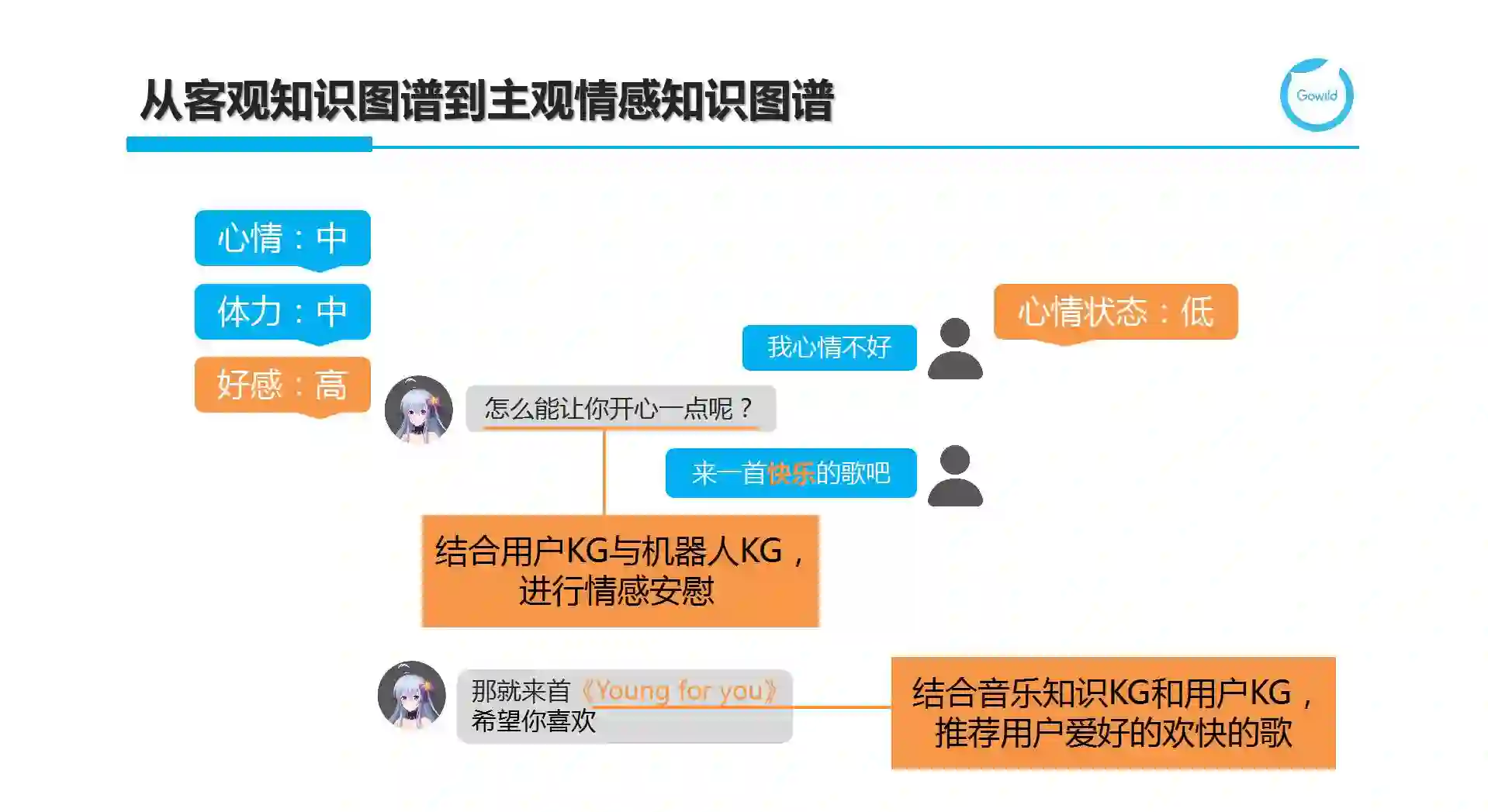 第三,机器人不能只是冷冰冰的回答用户的问题或帮助用户完成特定功能。它需要感知用户的情感并在输出答案回复的同时伴随着相应的情感,这样才更加拟人化。我们发现,之前构建的知识图谱大多是客观的,即描述一些客观的事实。如何在结合个性化图谱时,能包括一些主观知识,进而刻画机器人或用户的情感元素。例如,用户说:“我心情不好”。这属于闲聊中的情感表达范畴。这时需要将用户当前的心情状态更新到用户图谱的对应维度数值中。相应地,机器人也会有自己的心情、体力,甚至和用户之间的好感度关联。当此时,机器人心情不错,同时和用户很亲密时,它就会主动关心用户。这样结合机器人和用户情感因素的动态回复会更加温馨和贴合场景。当在多轮对话时,用户进一步说:“来一首快乐的歌吧”。需要进一步结合音乐知识KG(快乐作为歌曲的曲风或风格标签)和用户KG中的音乐偏好,推荐用户喜好的欢快的歌。