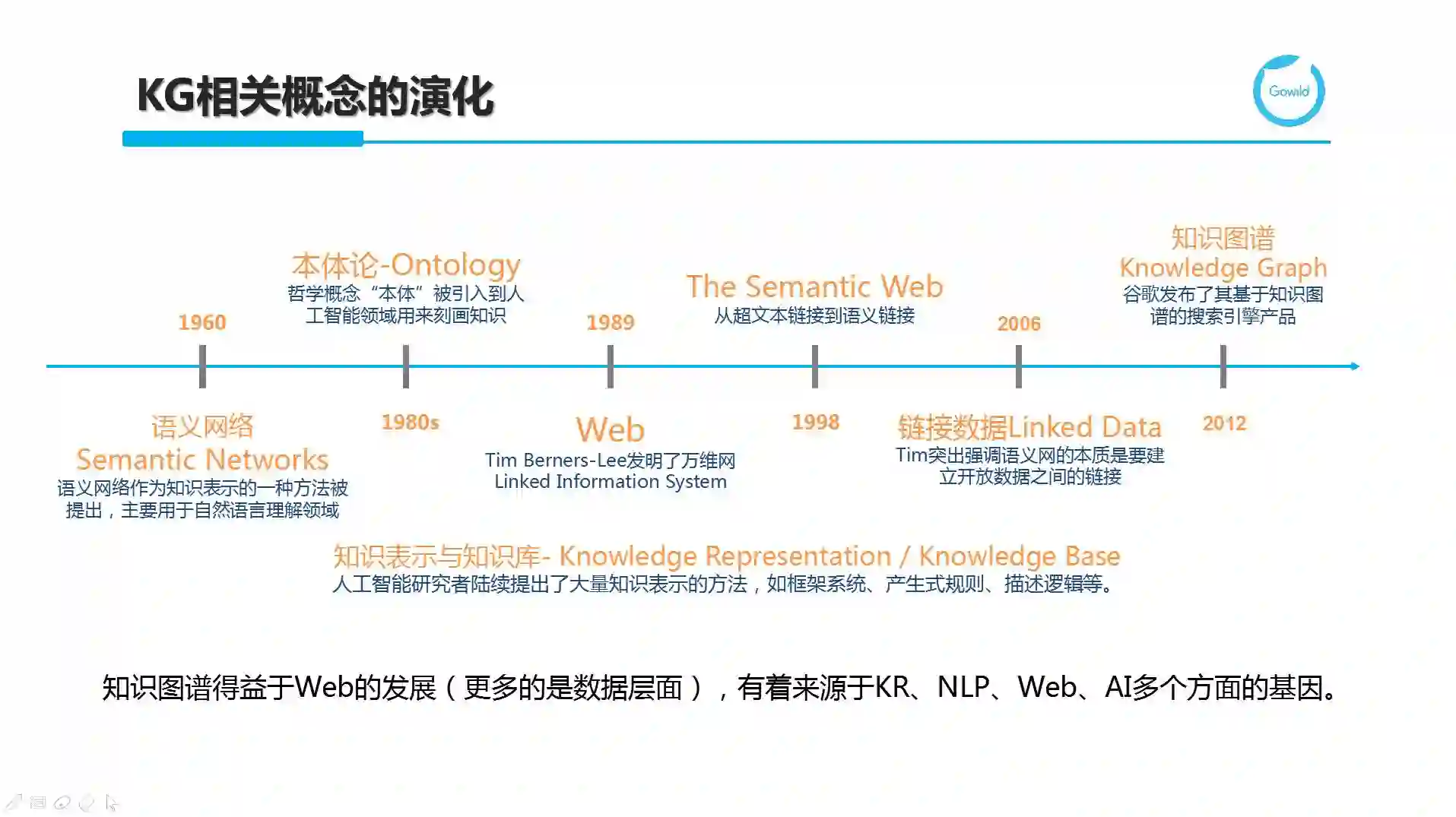 事实上,知识图谱得益于Web的发展,更多的是数据层面的积累,它有着来源于知识表示(KR,陆续推出了如框架系统、产生式规则和描述逻辑等方面的尝试)、自然语言处理(Natural Language Processing, NLP)、Web和AI等多个方面的基因。