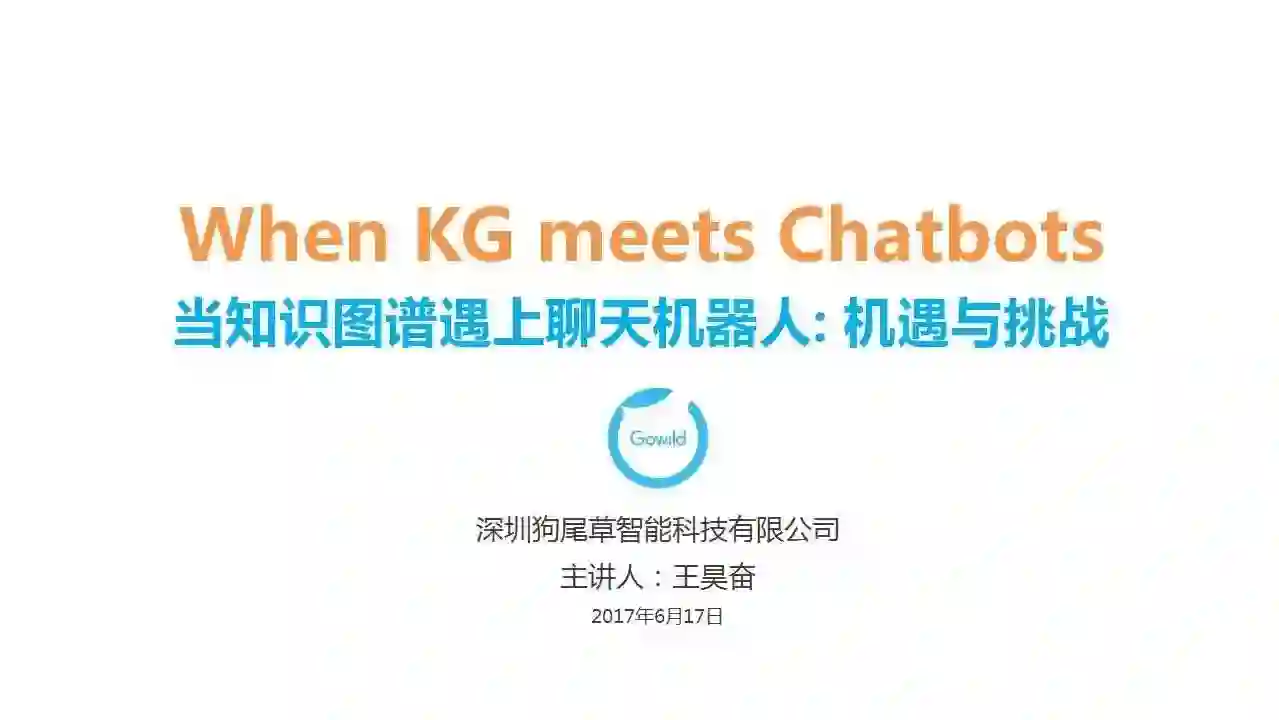 大家好,今天我演讲的题目是 When KG meets Chatbots,即当知识图谱遇上聊天机器人。具体来说,我们主要探讨一下,在聊天机器人(Chatbots)中,知识图谱(Knowledge Graph,KG)将如何融入,起到重要的支撑作用。