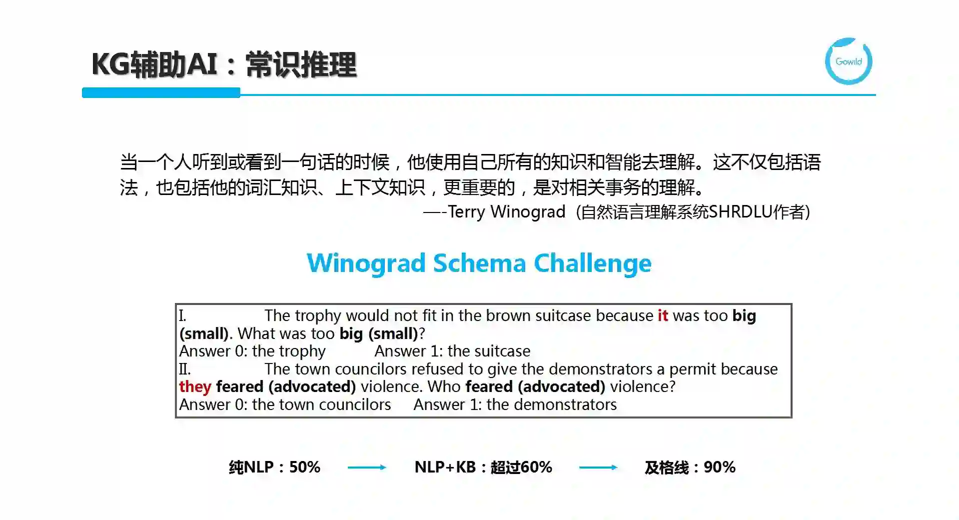 KG也可辅助通用人工智能(Artificial General Intelligence,AGI),即在常识推理方面起到作用。过去人们常用图灵测试对机器的智能进行评估,近年来,Winograd Schema Challenge逐渐进入大家的视线。