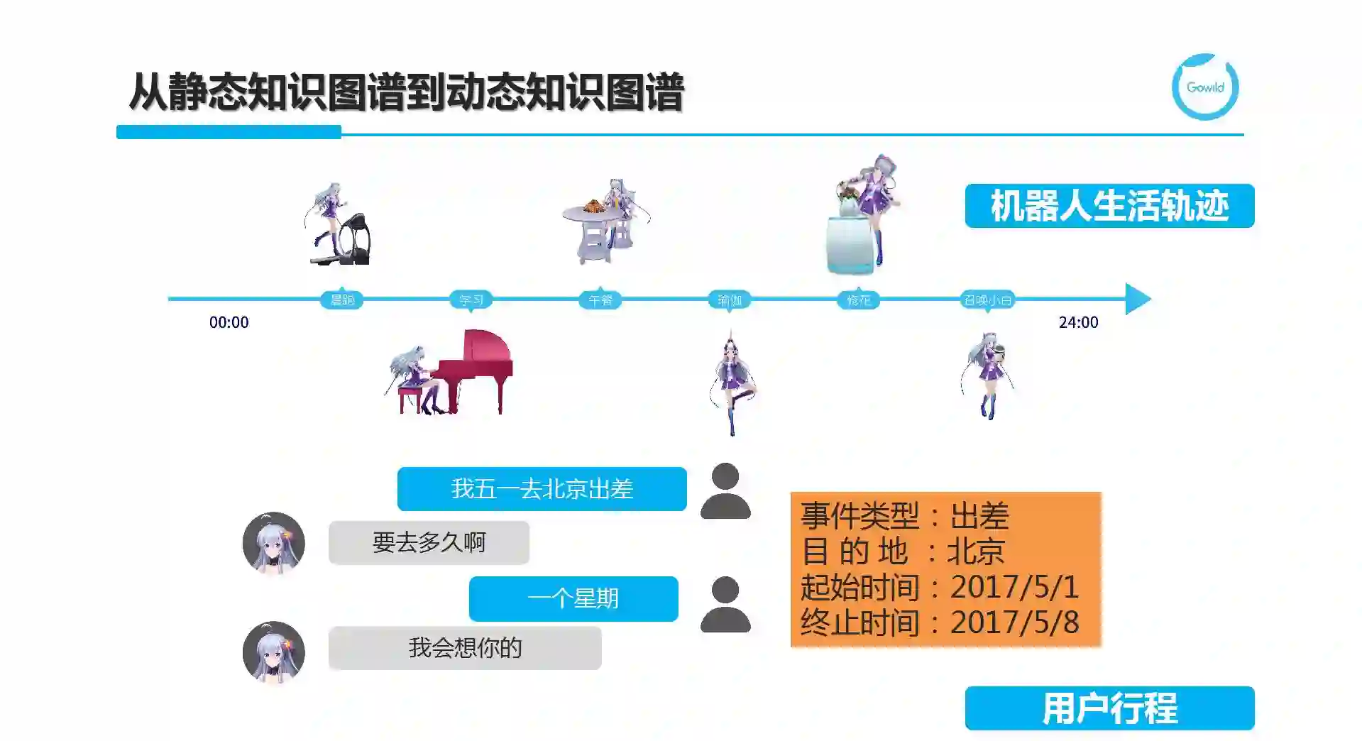 其次,我们的世界不仅仅是静态的,而是动态地反映各种事物在时空上的变化。因此,我们不仅仅需要刚刚谈到的静态图谱,而是需要思考如何表示和应用动态图谱。对于一个机器人,它从早到晚会做不同的事情,也就是有自己的生活规则。我们该如何刻画生活轨迹呢?这就需要我们在图谱中体现时态知识。另一个例子,用户行程,即对于用户图谱,需要记住用户各种已经发生、正在发生或即将发生的事件。图谱中的行程不仅仅是一个关系或属性,而是一个由多元(N-ary)组成的事件。我们需要定义多种事件类型,并刻画时间和空间两个维度。