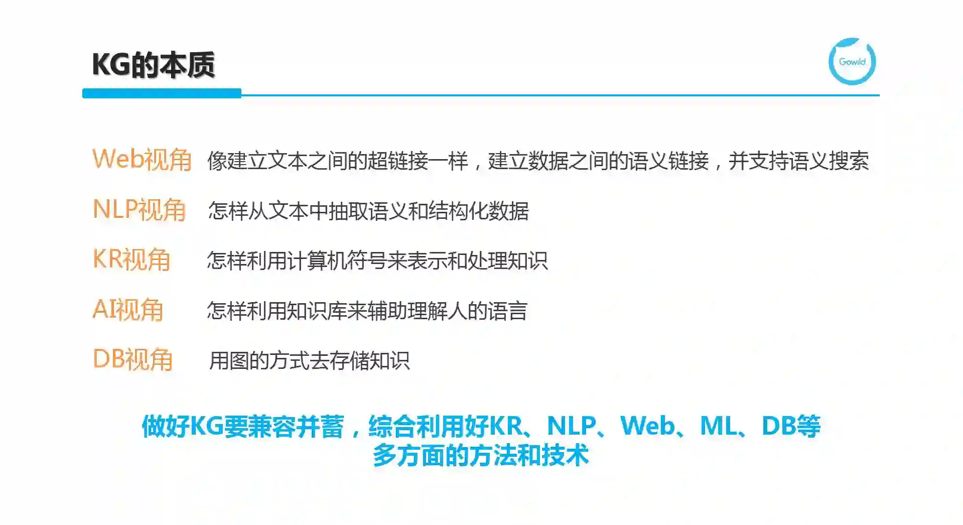 从Web的视角来看,KG像建立文本之间的超链接一样,建立数据之间的语义链接,并支持语义搜索;从NLP视角来看,KG关心如何从文本中抽取语义和结构化数据;从KR看来,KG即利用计算机符号来表示和处理知识;从AI的角度来看,KG考虑怎样利用知识库来辅助理解人的语言,而DB则关心如何用图的方式去存储知识。因此,要做好知识图谱,需要兼容并蓄,综合利用好KR、NLP、Web、机器学习、DB等多方面的方法和技术。