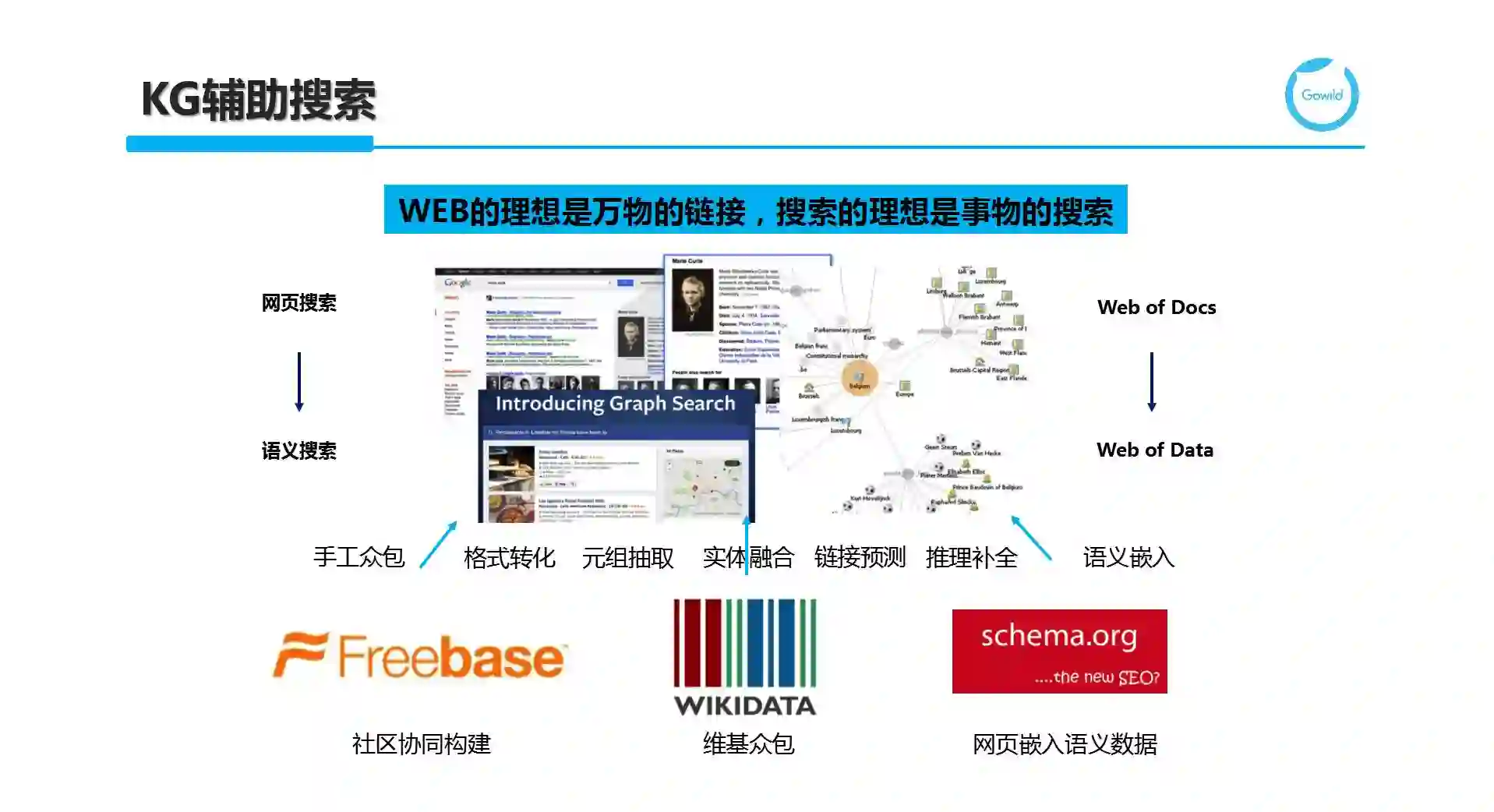 知识图谱于2012年由谷歌提出,旨在提供更好的搜索体验。随着整个Web从原先由网页和超链接构成的Web of Docs转换为由实体或概念及他们之间的关系构成的Web of Data,谷歌提出了更准确的语义搜索,旨在解决原有的关键字搜索仅基于字符串无法理解内容语义的局限。在KG发展的浪潮中,也诞生了基于社区协同构建的众包典范Freebase。而谷歌的Google KG也是基于Freebase逐步发展起来的。同样还有Wikimedia社区所推出的WikiData项目,目前Freebase也已经关闭,并将数据等均贡献给了WikiData做进一步发展。此外,作为谷歌、Bing、Yahoo!和Yandex(俄罗斯搜索引擎)共同推出的Schema.org,通过鼓励站点所有者(Site Owner)在其页面中添加符合Schema.org分类体系(及关联属性等)规范的语义知识片段(以嵌入在HTML页面中的RDFa或Microformats等形式出现)来扩充和完善知识图谱。据悉,25%的站点和30%的页面包括Schema.org的标注。对应的回报是提升特定关键字或实体查询时相关站点(提供与关键字或实体相关的高质量语义标注知识)的搜索排名,从而起到免费搜索引擎优化(SEO)的作用。