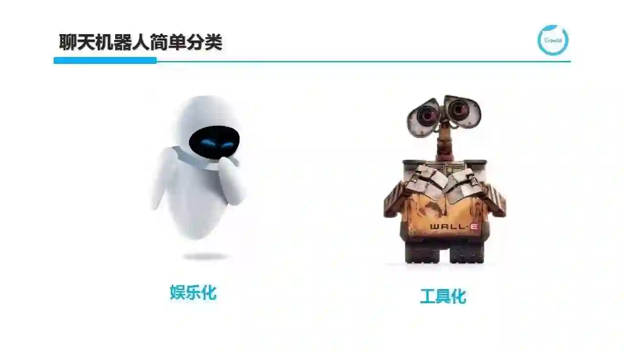 我们先对聊天机器人从分类角度进行一定的梳理。从最简单的二分类着手,即Chatbots根据其用途或使用场景,可以分为偏娱乐化或偏工具化。图中给出了一个鲜明的对比,白富美的Eva更擅长的是情感陪伴,而蓝领工人Wall-E则更擅长完成特定的工作。这两者由于目标不同,所以往往在Chatbots设计和技术选型上会存在一定的差异。微软公司很早就洞察了这一点,针对偏娱乐化场景和偏工具化的应用分别推出小冰和小娜。