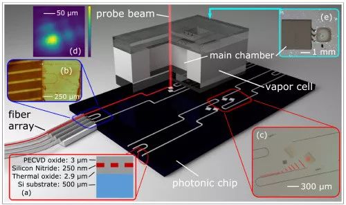 NIST 芯片长为14毫米(约0.55英寸),宽为9毫米(约0.35英寸)。波导由氮化硅制成,它可以控制各种光线频率。蒸汽室是由硅和玻璃窗经过微机械加工制成,有点类似在NIST 芯片级的原子钟和磁力计中使用的那些,也是由Kitching的研究小组开发。