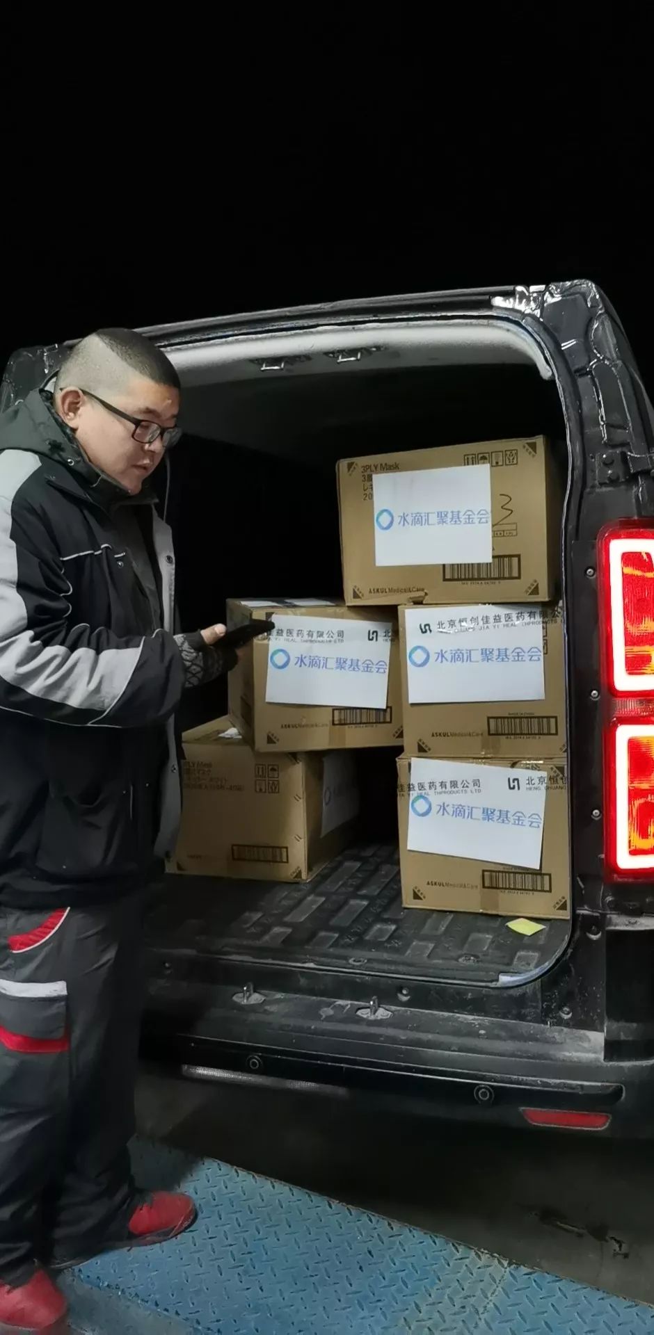 水滴已经通过原有的供应商自采,发出了第一批10000只口罩到武汉儿童医院、800箱一次性橡胶手套发往荆门市慈善总会、12000只口罩发往武汉市第七医院、30箱1800瓶消毒液发往湖北省神农架民政局。