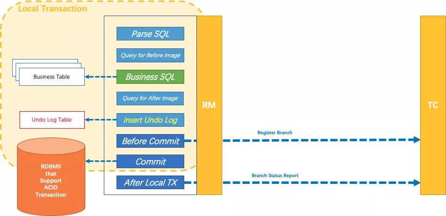 综上所述,RM模块通过对JDBC数据源进行代理,干预业务SQL执行过程,加入了很多流程,比如业务SQL解析、业务SQL执行前后的数据快照查询并组织成UndoLog、全局锁检查、分支事务注册、UndoLog写入并随本地事务一起Commit、分支事务状态上报等。通过这种方式,Fescar真正做到了对业务代码无侵入,只需要通过简单的配置,业务方就可以轻松享受Fescar所带来的功能。