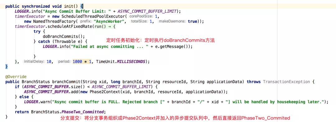 在接收到TC发起的全局提交消息后,经RmRpcClient对通信协议的处理,再交由RMHandlerAT来完成对分支事务的提交,分支事务提交从RMHandlerAT.doBranchCommit()开始,但最后由AsyncWorker异步Worker完成,直接看AsyncWorker中的代码实现: