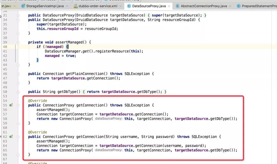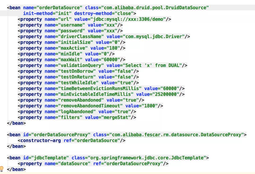 上图是Fescar源码examples模块dubbo-order-service.xml内的配置,数据源采用druid的DruidDataSource,但实际jdbcTemplate执行时并不是用该数据源,而用的是Fescar对DruidDataSource的代理DataSourceProxy,所以,与RM相关的代码逻辑基本上都是从DataSourceProxy这个代理数据源开始的。