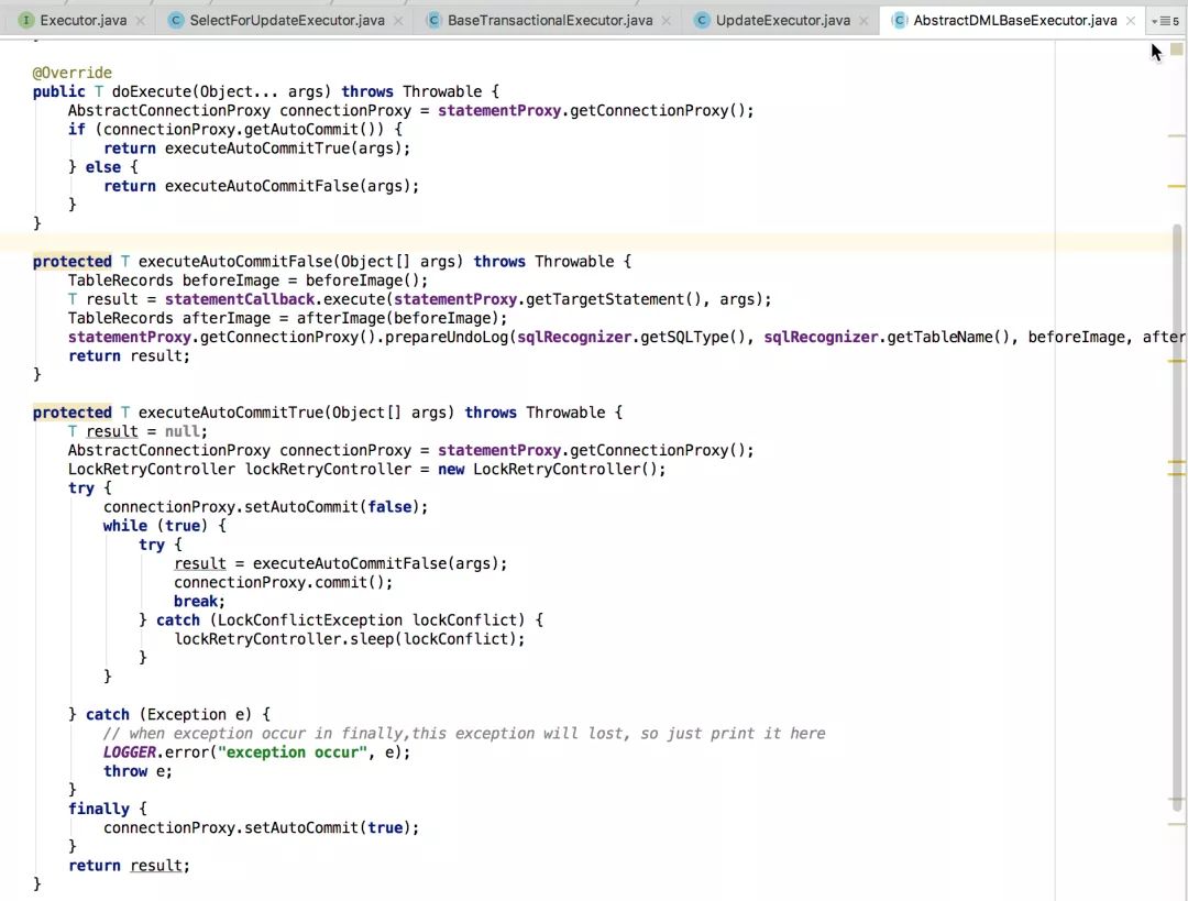 为结省篇幅,选择UpdateExecutor实现源码看一下,先看入口BaseTransactionalExecutor.execute,该方法将ConnectionProxy与Xid(事务ID)进行绑定,这样后续判断当前本地事务是否处理全局事务中只需要看ConnectionProxy中Xid是否为空。