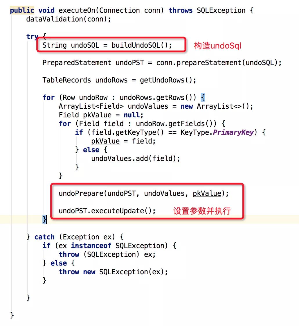 AbstractUndoExecutor undoExecutor = UndoExecutorFactory.getUndoExecutor(dataSourceProxy.getDbType(), sqlUndoLog); undoExecutor.executeOn(conn);