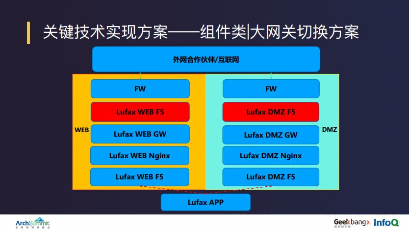 这种方式的好处是:所有 GW 应用的状态都可以配置成无状态的,同时可以进行必要程度的水平扩展;所有合作伙伴的服务健康检查也可以在 F5 侧进行配置;给切换场景带来的好处是可以在大网关物理线路上做冗余配置,在切换过程中可以转化为整个网络的链路切换,类似于路由切换、防火墙策略切换,以及与互联网域名相关的 DNS 切换。