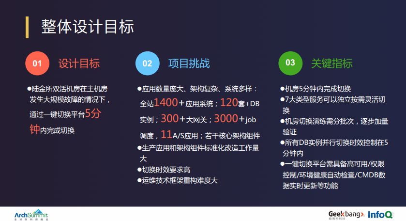 陆金所发展到现在已经是个很庞大的系统,包含超过 1400 个子应用,120 套 DB 实例,300 个大网关,3000 个 Job 调度,非自研、非外购的不能做双活的主备系统,基于状态的核心组件,例如分布式锁、文件系统等等。基于这样庞大的应用系统,想要在 5 分钟之内完成主机房全部组件的角色切换,难度是显而易见的。