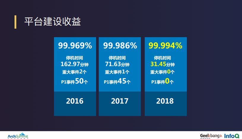 上图是直接带来的收益数据,陆金所本身的业务每年也在呈几何增长,但我们的服务支持、可用性在 2018 年达到了一个很好的水平,这完全依赖整个切换服务和架构改造。