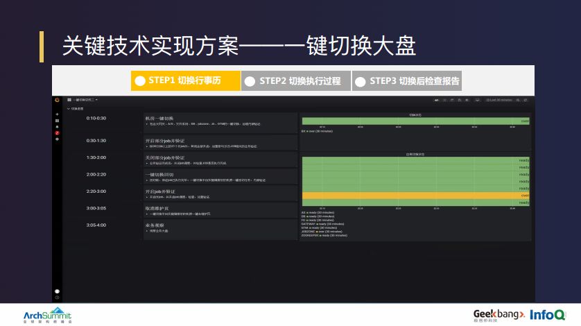 除了切换平台之外,切换大盘同样很重要。在切换之前,除了切换操作人员以外,参与日常切换演练的其它同学,例如开发、测试、架构、运维相关的同学,其实都不会使用到切换平台,大部分看的都是切换大盘。切换大盘在切换之前主要展示的是详细的切换行事历,主要目的是希望所有参与切换的同学能够十分清楚的了解这次切换的具体细节,以保证在整个切换过程中大家的信息是同步的。