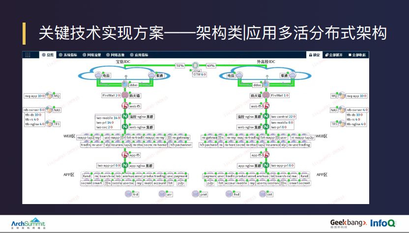 陆金所现在建成的是两地三中心,就是同城双活、异地灾备。异地灾备和同城双活现在的流量分配是 50:49:1,我们会分差不多 1% 不到的流量到河北廊坊的机房,让这个灾备机房永远是一个热的状态,但是承载相对少的流量,以确保在我们真正需要启用灾备的时候,能够迅速的把服务拉起来,并且确保服务的可用性。