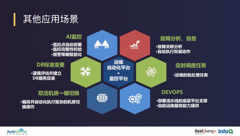 刚才说的 DevOps 流水线和自动化运维的技术框架,不但在切换服务中使用,而且也在陆金所技术运营相关的其它场景中使用。我们的标准化变更、监控、故障分析和自愈、整个 DevOps 全流程都是基于这一套技术体系搭建起来的,这套技术体系是陆金所运维中台核心的子系统。