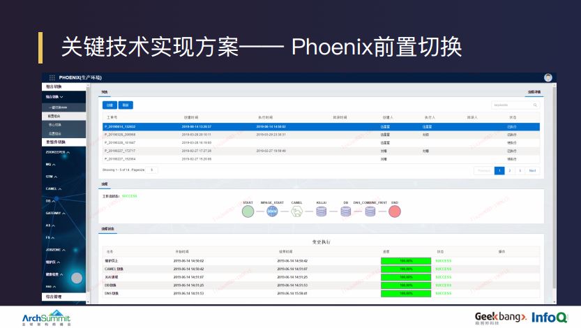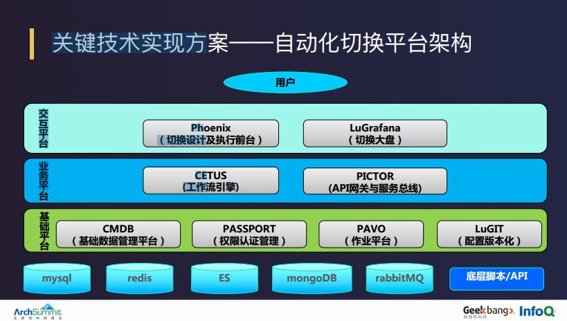 上图是整个切换平台的架构,不是特别复杂,基本上分为三个层次,第一层是交互层,主要是由 Phoenix 平台跟 LuGrafana 组成,分别用来执行切换操作和切换大盘;业务层主要是由流程引擎、服务总线和 API 网关组成;最后一层是基础层,主要是由 CMDB 配置中心、统一权限认证管理 PASSPORT、作业平台 PAVO 和配置版本中心 LuGIT 组成。