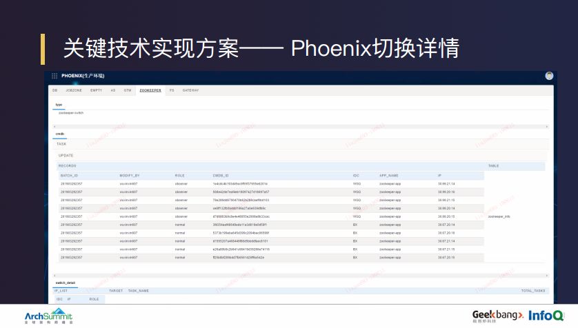 上图展示了切换组件的切换详情,我们内部业务把它称为切换计划。它主要展示的是组件的切换类型、切换动作、切换资源以及切换参数,同样也有对应的 CMDB 闭环原数据的更新逻辑。除此以外,我们还要求每个组件在正常的切换数据展示之外,还要在生成切换计划的时候,要提供组件切换异常时回滚的参数。我们在切换以前,会反复确认各个资源的属组、切换原数据的正确性,以保障切换动作的可靠性。