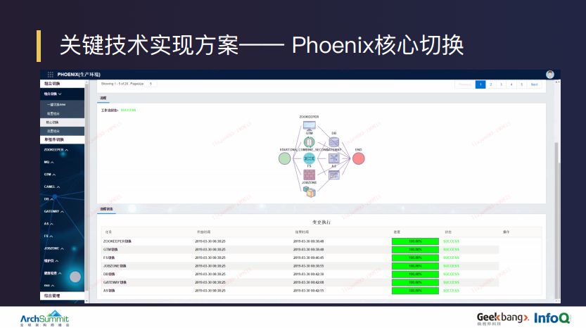 上图是我们切换平台的主界面,左边是具体的服务目录,右上是整个可视化的流程展示,右下是执行任务具体的每一个执行结点、执行时间、状态进度等等的展示。