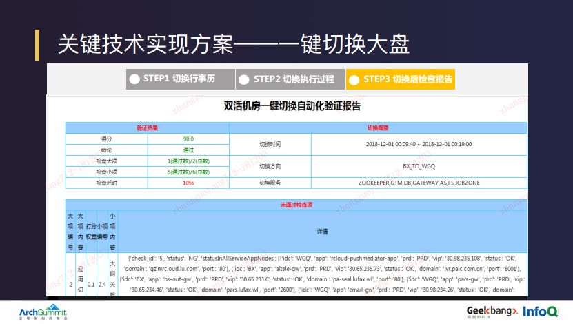 后置切换,主要是完成陆金所全站服务可用化的自检。自检结果会生成一个可用性报告,目的是让相关的切换同学比较直观的看到这次切换结果是不是和预期的一致。