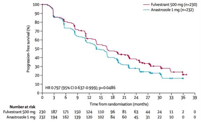 图2:FALCON试验结果显示单药氟维司群组患者PFS明显长于单药阿那曲唑组