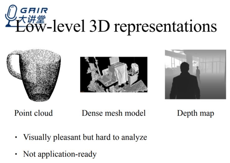 大家都知道,从一个场景中理解分析三维的几何信息是一个非常重要的计算机视觉问题。传统的方法多是用一些底层次的三维表示,比如说密集的点云、密集网格模型或者是深度图。这些低层次的三维表示虽然看起来很美观,但是却不好分析和理解,因此并不是很实用。