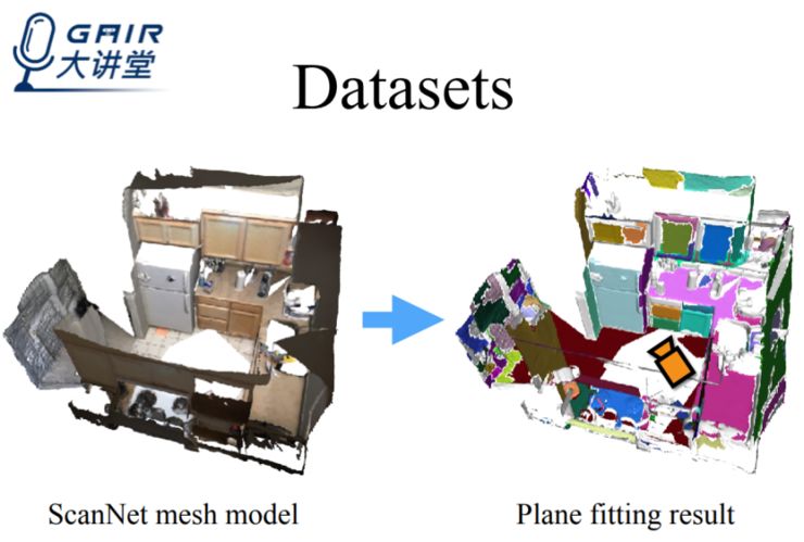 此外,我们使用了包含多种三维模型的 ScanNet 数据集作为训练网络,结合相机参数,将三维空间中的平面投映到二维上来,以获得最终需要的训练数据——plane parameters, segmentation masks 和非平面区域的 depth map。