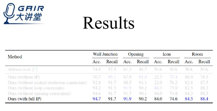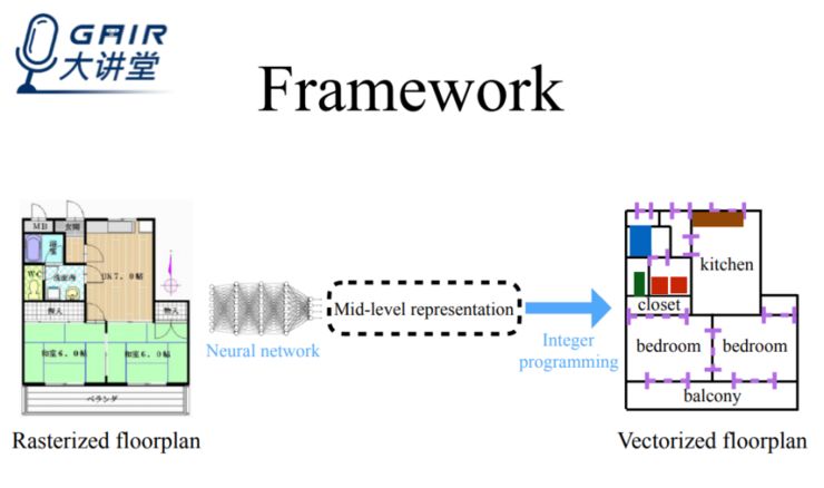 为了获取矢量图,我们借鉴了 Human pose estimation 方法,并解决了所面临的任意拓扑挑战。在我们的工作中,会先通过深度网络找到图中的关键元素(墙角、门、物体……),然后再利用 Integar Programming(IP)进行优化。总的来说,前者构成了我们的中间层表示,后者最终优化出最终的结构图。