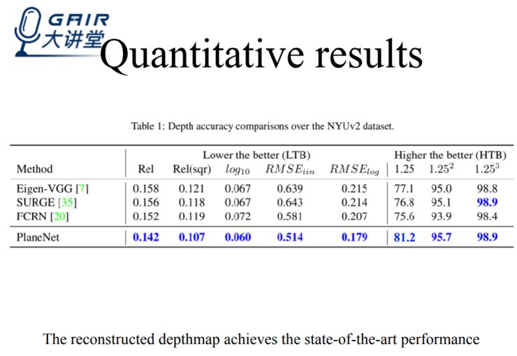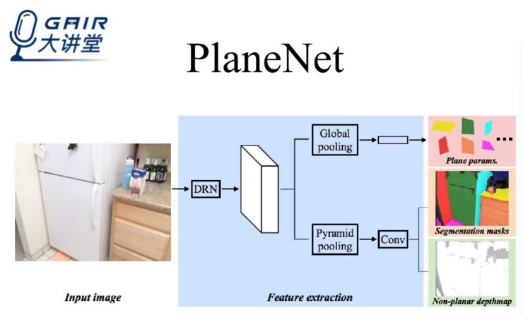 在我们的工作中,我们假定一个图像拥有十个平面,每个平面分别用三维空间中的三个参数来表示,最终确定三维结构;为了进一步确认在三维空间中的范围,我们会计算 segmentation masks;至于非平面区域,则估算 pixel-wise 的 depth map。