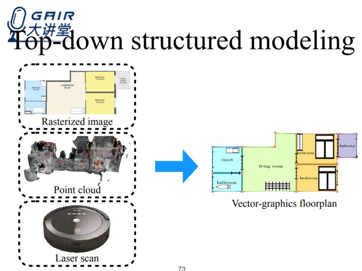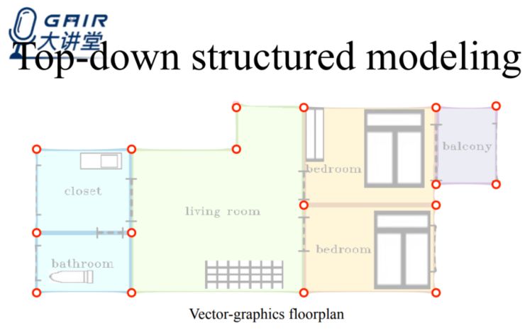 在俯视图结构化重建上,由于墙和地面往往是垂直的,所以俯视图能够给我们提供非常多的信息,我们的目标是希望能够得到矢量图形平面图,主要是基于墙角的点以及所有墙角之间的连线,这将对我们理解整个室内结构提供非常多的有用信息。