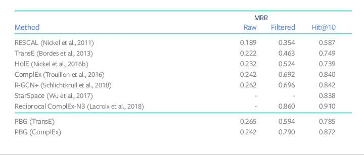 论文中,我们成功证明 PBG 与 FB15k 数据集最先进的嵌入方法效果相当。