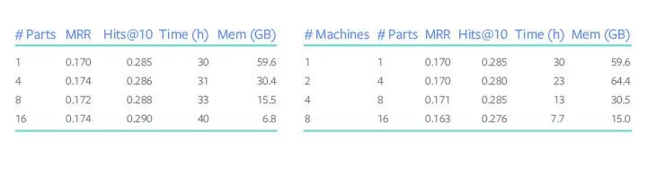 PBG分区方案可在不降低模型质量情况下,将内存使用量有效减少 88%。使用多台并行机器可以减少更多训练时间。