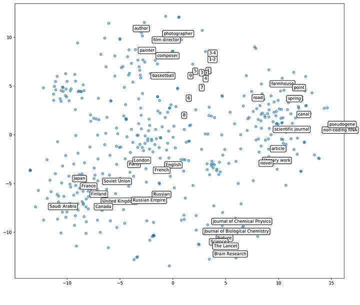 PBG 基于 Freebase 知识图所训练的嵌入 t-SNE 图。如国家、数字和科学期刊之类的实体具有类似的嵌入情况。