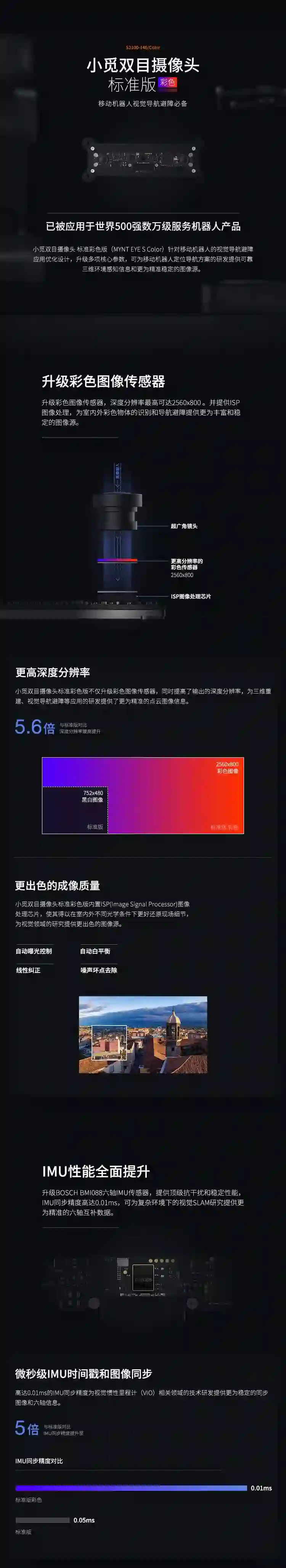 与原标准版主线产品相比,IMU有了约5倍的精度提升,如此一来可为移动机器人定位导航方案的研发提供更可靠的三维环境感知信息和更为精准稳定的图像源。