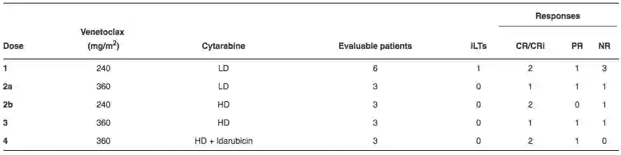 该研究为rolling-six设计Ⅰ期研究,入组患者包括复发或者对至少2个诱导治疗疗程未获缓解的AML患者。所有患者在第1~28天接受venetoclax(240 mg/ m2或360 mg/ m2),并且从第8天开始接受低剂量(100 mg/ m2 每12小时× 20次)或高剂量(1000 mg / m2 每12小时×8次)阿糖胞苷(表)。先前接受阿霉素的总剂量<270 mg/ m2的患者在第8天接受剂量水平为4的伊达比星12 mg /m2; 其他患者纳入接受剂量水平为3的扩增队列。非血液性CTCAE 3级或更高级别的毒性为强度限制性毒性(intensity limiting,ILT),但不包括大剂量阿糖胞苷常见毒性。