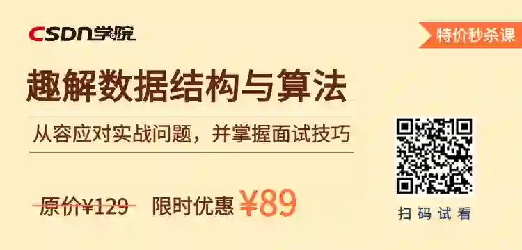基于这个思路,我向你推荐这门由前阿里巴巴工程师与 CSDN 共同打造的《趣解数据结构与算法》课,为你让你更容易吸收,老师将会采用「图解」的方式带你从 0 学习,同时向你分享更多攻克大厂算法面试的真题与解题技巧!