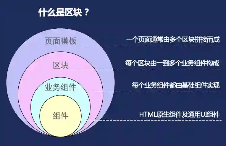什么是区块?我们来看下面这张图,一个页面通常由多个区块拼接而成,每个区块由一到多个业务组件构成,每个业务组件都由基础组件实现。在低代码平台里,基础组件和业务组件都属于原子组件,即不可拆分的、平台内置的、可以拖到画布用于搭建区块的组件。一个复杂的页面通常可以拆分成若干个区块,而区块里面也可以嵌套区块。只要让用户能够复用已搭建好的区块,复杂的页面就像搭积木一样,一层层摞起来即可。