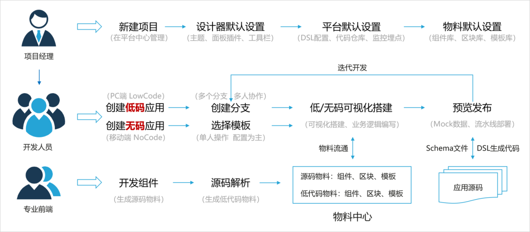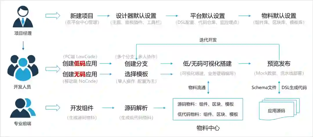 开发人员可以在平台上创建低码或无码应用。如果是低码应用,则可以创建分支,支持多人协作;如果是无码应用,只需选择模板,做一些简单的配置。经过一系列的迭代开发,用可视化工具搭建完页面,平台就可以通过 DSL 生成代码,最后用流水线部署应用。在开发过程中,如果发现组件缺失,还可以通过专业前端开发相应的组件,然后作为源码物料导入到物料中心。另外,由于用户也可以自行搭建可复用的区块,将区块作为低代码物料发布到物料中心,形成物料的双向流通。