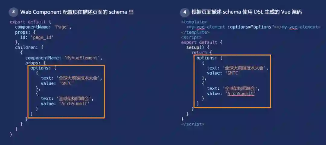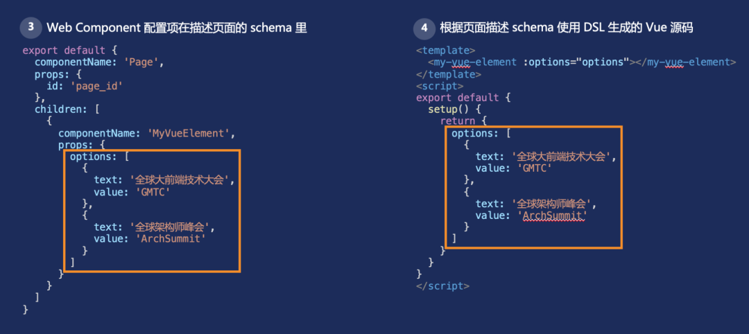 接下来,我们将画布的 HTML 内容,用 AST 抽象语法树,解析成一个 JSON 对象,即描述页面的 Schema。从下面左侧的图可以看到,Web Component 组件的 options 属性,它仍然是数组类型。然后我们通过 DSL 将页面描述 Schema 转换成 Vue 的源码。从下面右侧的图可以看到,Vue 组件的 options 属性,也仍旧是数组类型。于是我们发现,从 Web Component 封装组件开始,到生成 Vue 的源码,整个过程中,给组件属性设置的值是可以透传的。