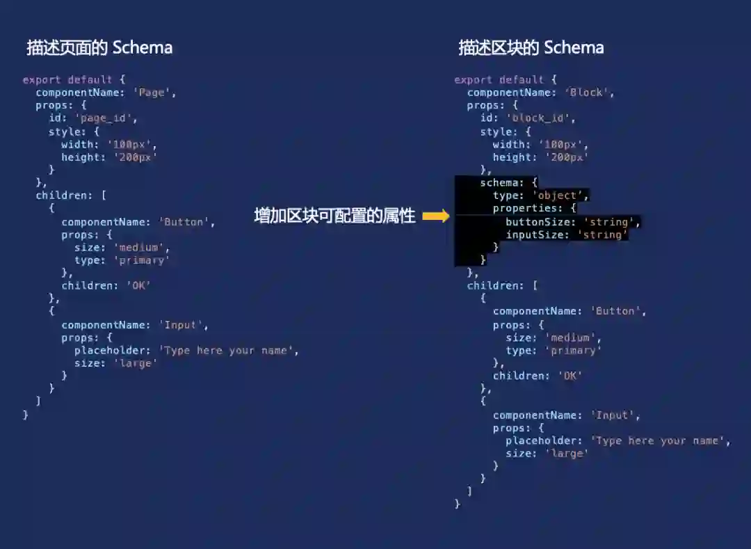我们用低代码平台搭建的页面,会有一个描述页面信息的文件,这个文件我们称为页面 Schema。如下图左边所示,可以看到这个页面只包含两个组件,一个是 Button,另一个是 Input。如果我们认为这个页面可以复用,我们就把它转为区块,这时候该区块可以理解为:可配置的页面。所以只需在页面的 Schema 里面,增加区块可配置的属性,它就变成了描述区块的 Schema。如下图右边所示,该区块暴露了两个配置项:buttonSize 和 inputSize,分别对应页面包含的 Button 组件和 Input 组件的属性。