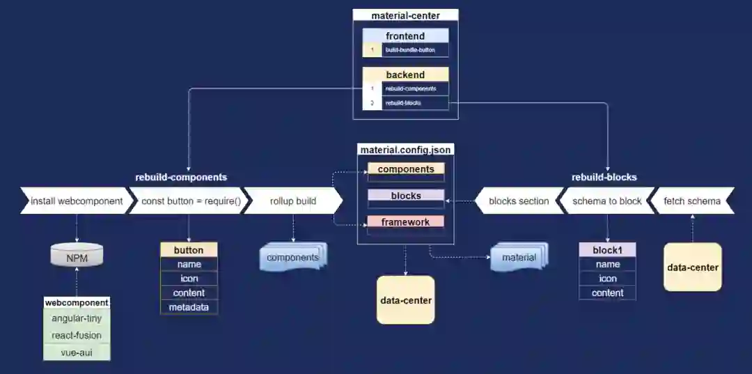 接下来我们看一下,物料中心的两个产物,物料资产包和组件库,它们是如何构建的。如下图所示,首先在物料中心的前端页面,我们点击构建组件和区块的按钮,后端服务就会分别执行构建动作。先看左边的组件构建流程,我们会根据用户选择的技术栈,安装相应的 Web Component 组件库,接着生成构建代码,代码里引入用户选择的组件,并且按照物料资产协议,输出该组件的描述信息,最后用 Rollup 打包构建,生成组件库。