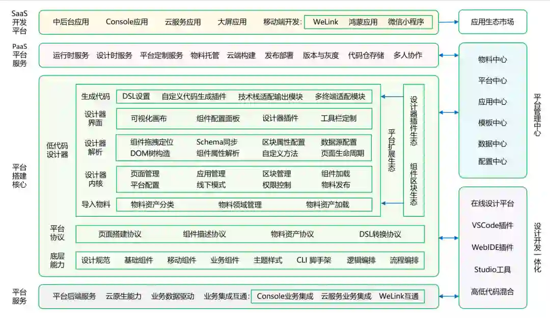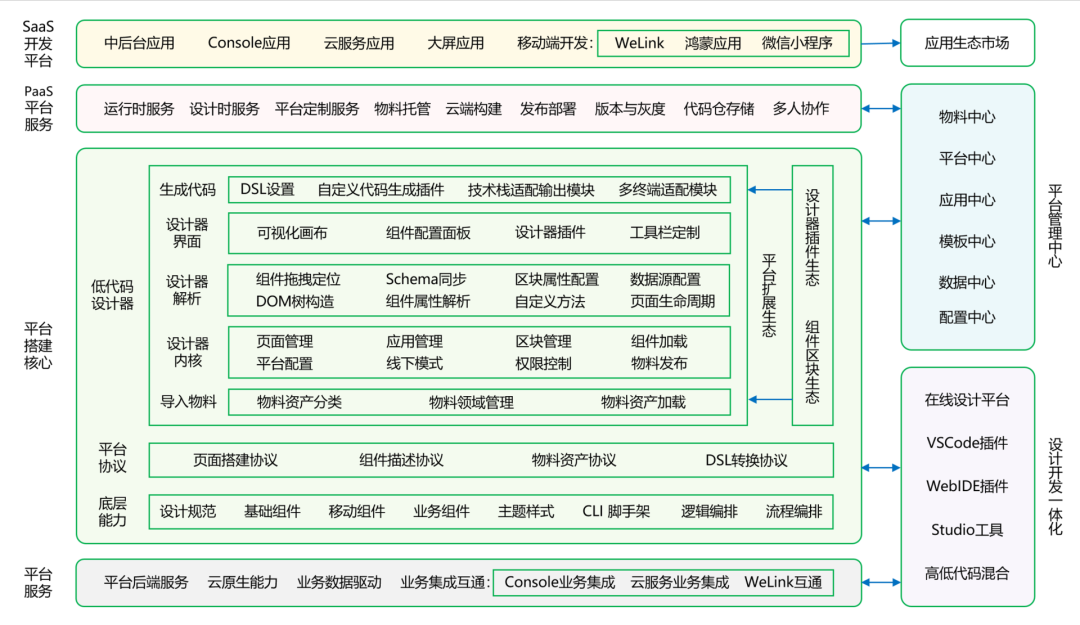 有了 PaaS 平台之后,我们就可以提供 SaaS 能力,既可以开发传统的中后台应用,也开发华为云的 Console 控制台应用,甚至包括我们的 WeLink 移动端应用、鸿蒙的多端应用,然后再将这些应用发布到我们的应用生态市场。