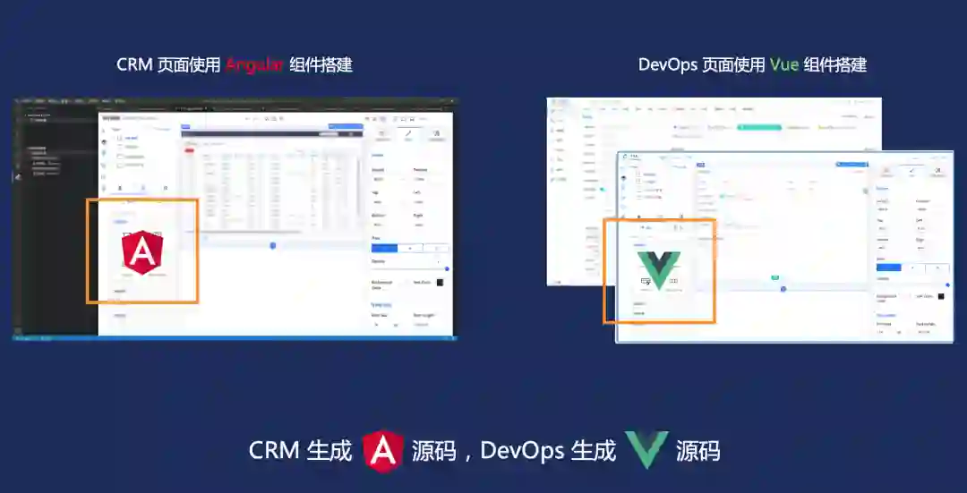 CRM 采用 Angular 技术栈,DevOps 采用 Vue 技术栈。所以在 CRM 低代码平台搭建页面所用的组件,必须是 CRM 系统当前使用的 Angular 组件,而 DevOps 则是 Vue 组件。CRM 低代码平台生成的源代码,必须是 Angular 技术栈,而 DevOps 则是 Vue 技术栈。如下图所示: