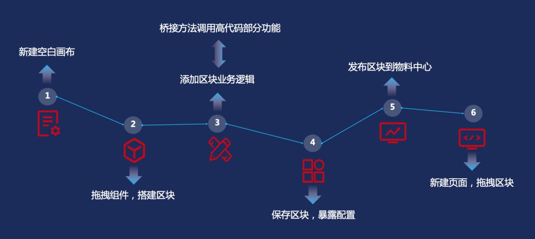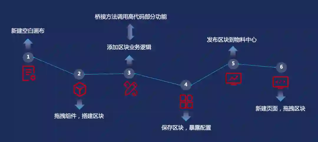 以下这张图展示了低代码区块的创建和消费过程。首先,从新建空白画布开始,用户在画布上拖拽组件、搭建区块,接着添加区块的业务逻辑。这里需要说明的是,我们提供了一些桥接方法,让用户可以调用高代码的部分功能,即前面提到的高低代码混合开发时,需要跟页面的其他纯手写的部分相互通讯、协调运行。第四步就是保存区块,让用户选择暴露的配置项,即将区块里所有组件的所有属性都罗列出来,让用户选择哪些属性可以对外暴露,以便复用的时候进行配置。第五步是发布区块到物料中心,这样下次新建页面的时候,用户就可以将这个区块拖到画布上,重复使用。