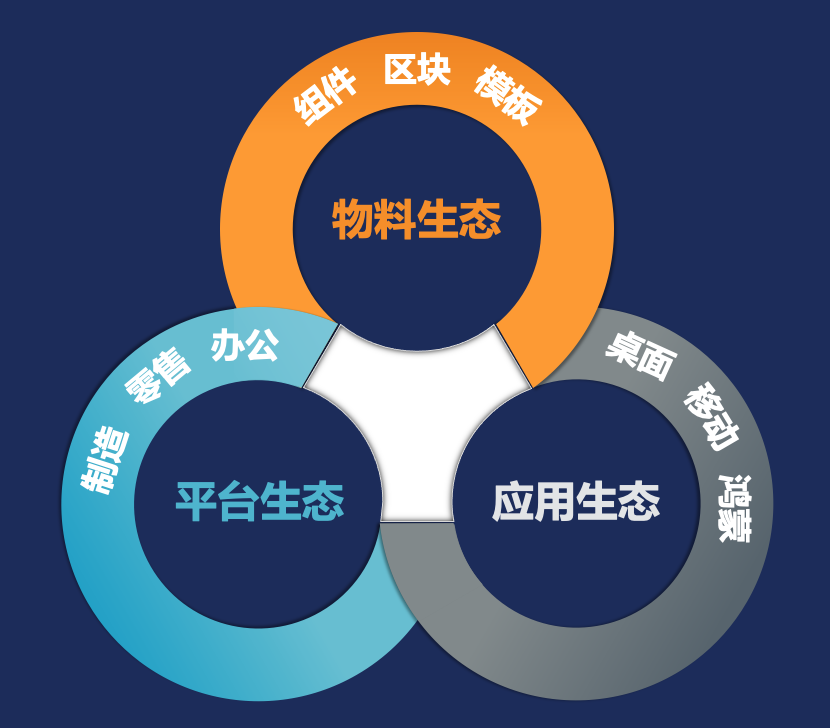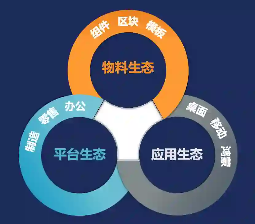 低代码的物料生态、平台生态、应用生态,这三者不是互相孤立的,而是相辅相成的。我们要把这三个生态圈打通,形成合力,这样下面这张图,就不是三个圈,而是三个环环相扣的 8。