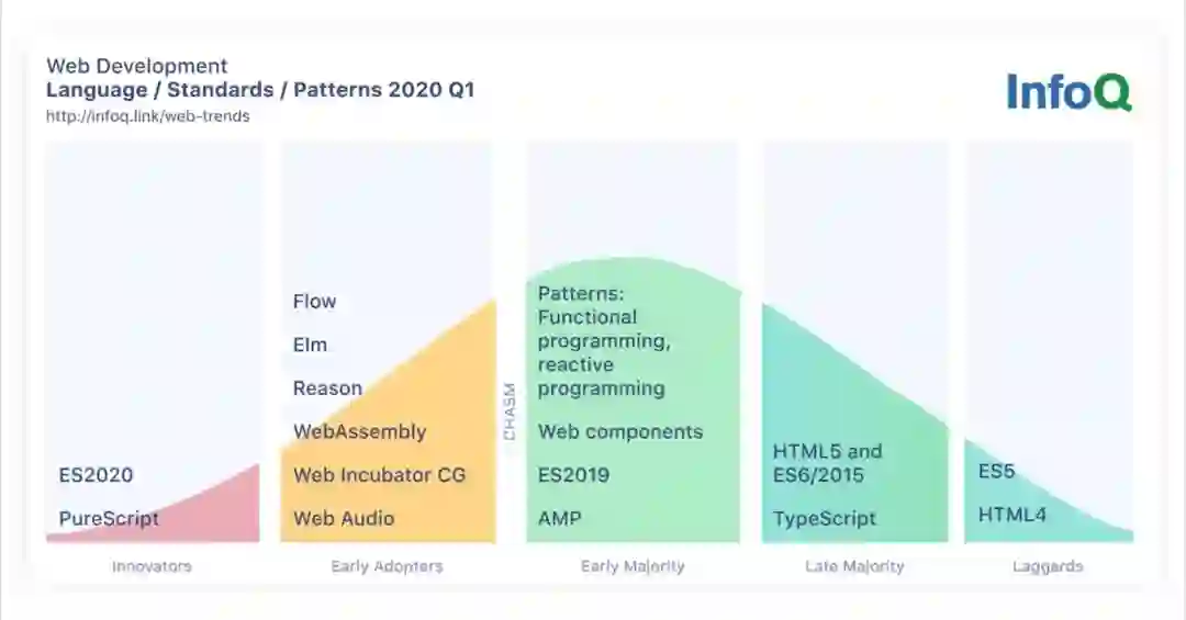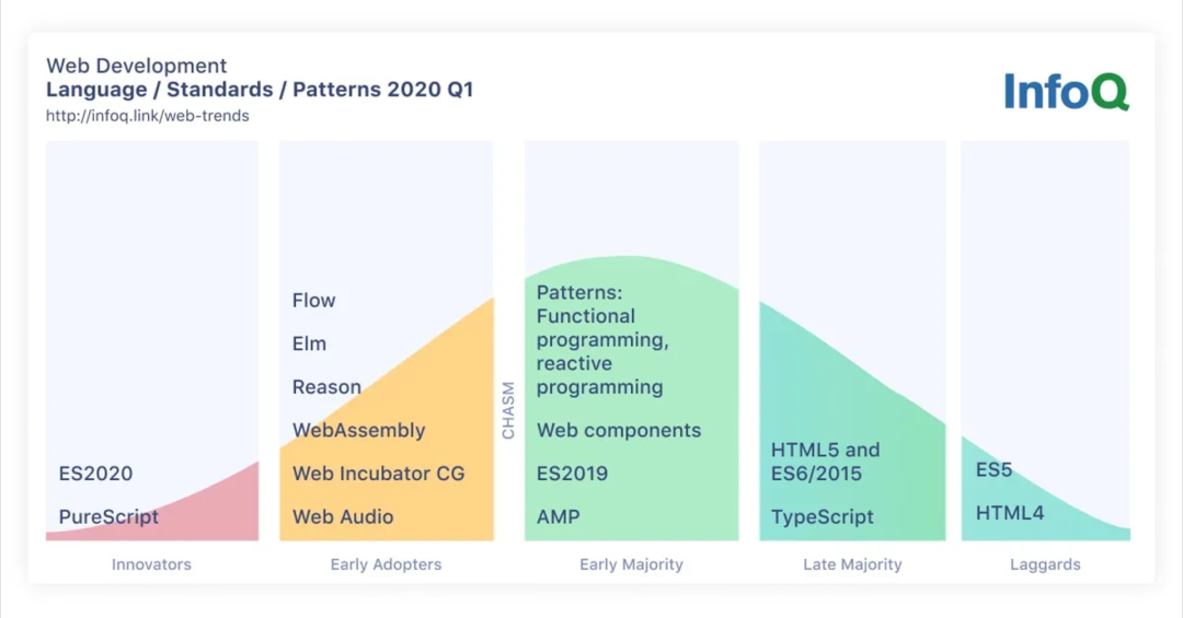 上图是 InfoQ 2020 年一季度,Web 开发相关的语言、标准、模式趋势图。可以看到 Web Component 处于中间位置,说明它已经到了主流成熟阶段,我们可以使用 Web Component 来解决跨技术栈问题。